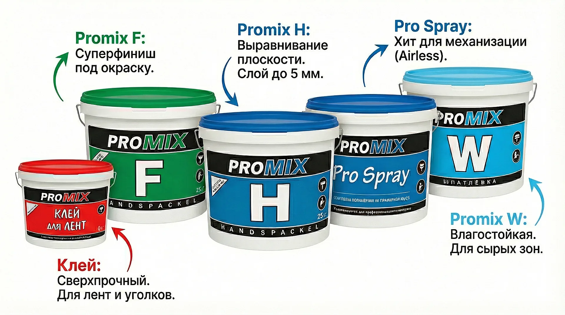 Готовые полимерные шпаклёвки PROMIX — это линейка профессиональных паст для внутренних работ: выравнивание плоскости, швы ГКЛ, влагостойкие зоны, механизированное нанесение и суперфиниш под покраску (включая требования уровня Q4). Подберите материал под задачу: H 200/H 300 — для выравнивания и заполнения дефектов, ProSpray — для больших объёмов и механизации, F — для суперфиниша под высококачественную покраску, W — для влажных помещений, J — для швов и стыков