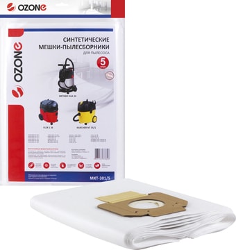 - Description: Универсальные синтетические мешки-пылесборники Ozone MXT-301/5 для профессиональных строительных пылесосов Karcher, Makita, Mirka, Nilfisk и др. Технология MICROMELT, армированный слой. Упаковка 5 шт. Заказывайте!