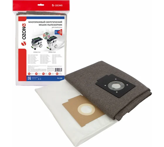 alt: Многоразовый синтетический мешок-пылесборник на молнии Ozone PL-510 для строительных пылесосов FESTOOL (1 шт) title: Многоразовый мешок-пылесборник Ozone PL-510 на молнии для профессиональных пылесосов FESTOOL