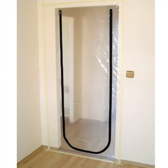 Полотно толщиной 100 мкм обеспечивает надёжную защиту смежных помещений от строительной пыли, мусора и тумана краски. Конструкция рассчитана на многократное применение, что делает её удобным инструментом для профессиональных мастеров.