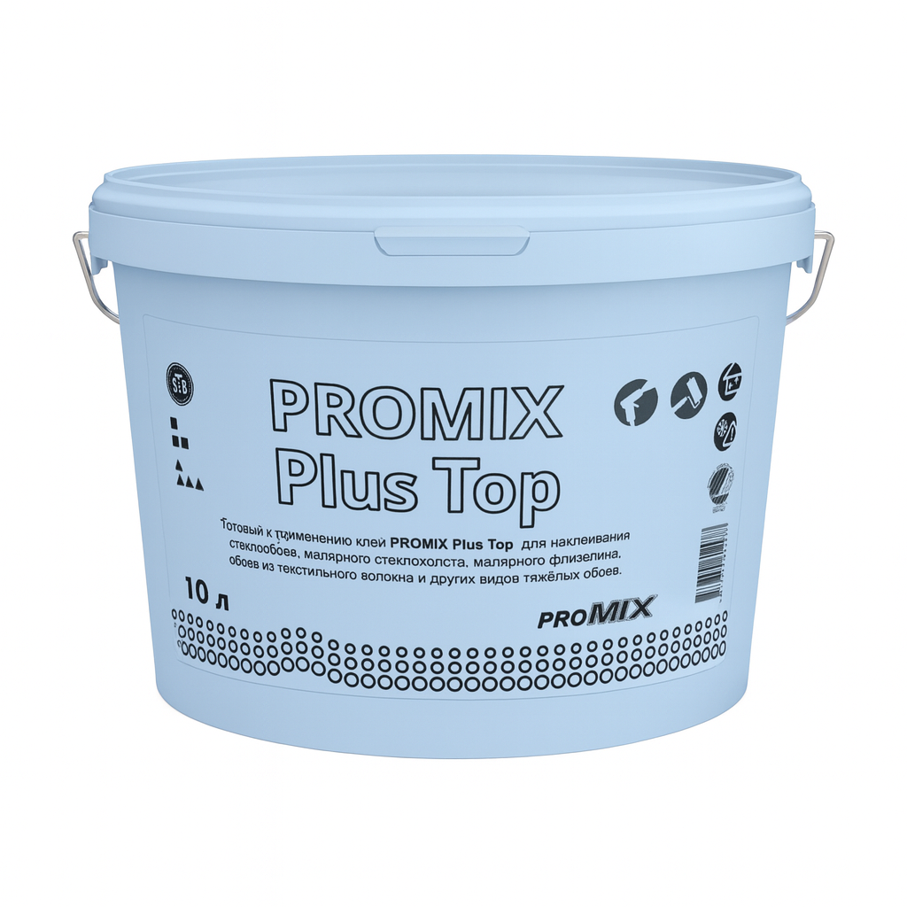 PROMIX Plus Top — готовый к применению клей, предназначенный для наклеивания стеклообоев, малярного стеклохолста, малярного флизелина, текстильных и других тяжёлых обоев. По данным производителя клей влагостойкий и рассчитан на работу в том числе в помещениях с повышенной влажностью (для тяжёлых обоев).