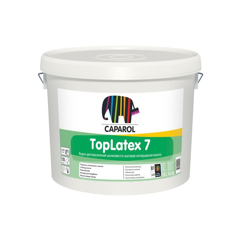 TopLatex 7 колеруется машинным способом по системе ColorExpress во все тона из цветовых коллекций CaparolColor, Caparol 3D, NCS, Panorama, RAL и многих других, известных на рынке цветовых коллекций. Интенсивные и чистые цветовые оттенки, например желтый, оранжевый, красный и т.д. обладают меньшей укрывистостью. Рекомендуется промежуточное покрытие в подходящем пастельном тоне на базе пигментированной белoй краски (база 1). Может потребоваться второе заключительное покрытие.