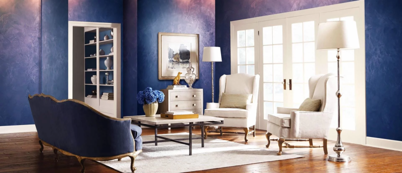 Сочетание глубокого синего цвета и деликатной жемчужной текстуры декоративного покрытия создает атмосферу утонченного комфорта, элегантности и особого шарма, делая гостиную настоящим центром притяжения.